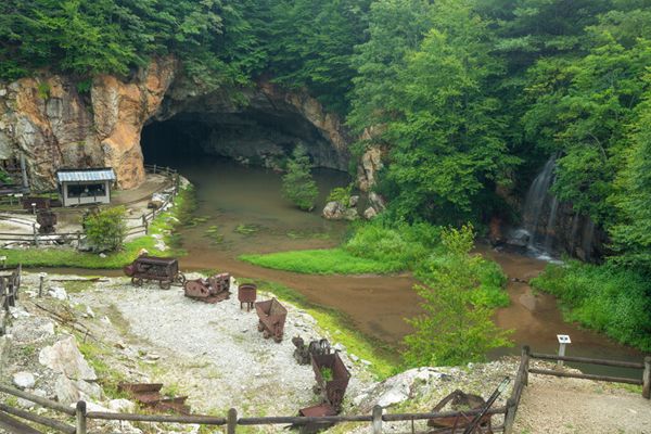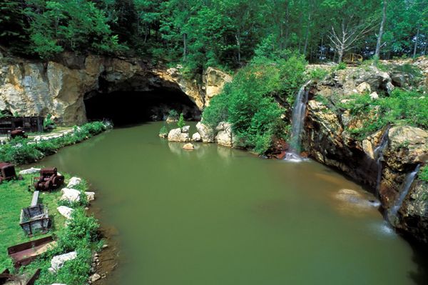If the mine is closed, you can view the falls by parking at the gravel pullout along the road and walking a few feet down to an overlook of the mine. If the mine is open, you will get the best view and have the best experience by taking the self-guided tour of the mine.