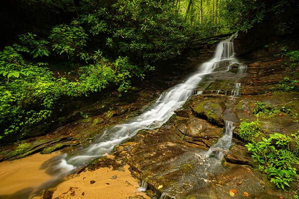 Briefcase Falls is a short distance downstream. There’s no trail, but you might pick up a faint path. The best route is to turn off the path leading to Case Falls before you reach the rhododendron and nastiness near the creek, then just follow the route of least resistance as you swing around and down. As you get close to the falls, you should pick up a noticeable path.