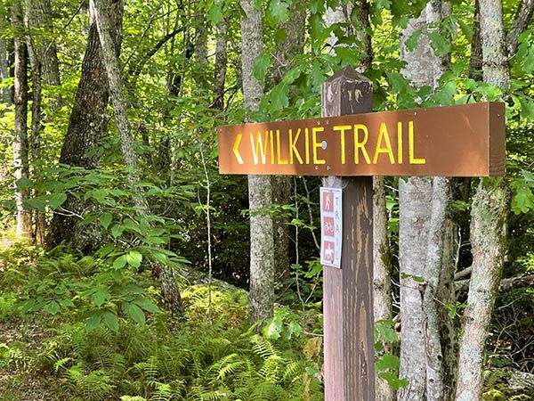 Follow Wilkie Trail on an old road for less than 0.2 miles to a not-so-obvious side path on the right. This path descends to the falls. If you continue Wilkie Trail for another 130 feet you’ll see a second, more obvious side path, that also descends to the falls. This path is a little longer but easier.