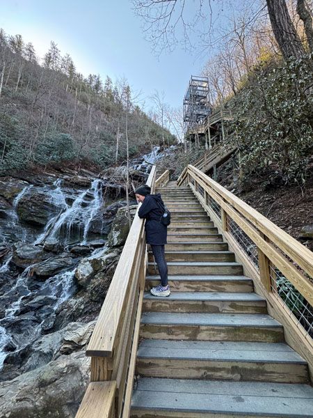 The stairs provide great views of Catawba Falls. As you’re climbing the steel tower section, you’ll also get views of frightened hikers clinging to the railing on the inside part of the stairs. You may also see, as I did, frightened dogs and those whose paws are hurting from the punched-steel steps.