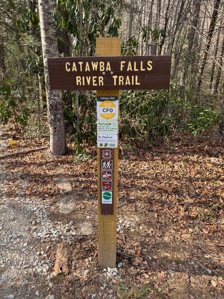 Catawba Falls River Trail starts to the right of the restrooms and follows the river upstream past Catawba Falls to Upper Catawba Falls. Catawba Falls Ridge Trail begins to the left of the restrooms and follows Allison Ridge to Upper Catawba Falls. Together, they form the 3.3-mile (not counting the stairs) loop hike.