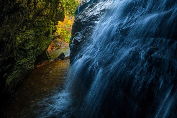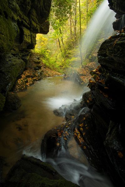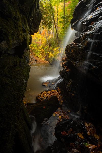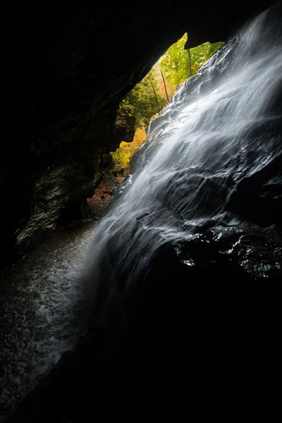Cavern Falls is proof that a waterfall doesn’t have to be high to be exciting. A large bluff overhands the falls and pool, creating a cave-like recess where half the waterfall lies.
