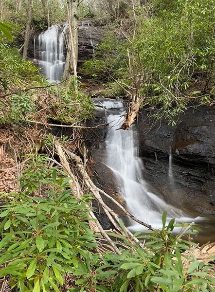When you reach the top of this falls, the path splits. Go left, away from the creek, and climb steeply for a little less than 0.2 mile to a faint side path that descends to Cherry Cove Falls. You’ll see the falls long before the side path, so you can be on the lookout for the side path.