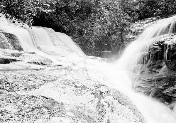 Speaking of Silver Slip, I've often heard it listed as a separate waterfall from Connestee and Batson Creek. Jim Bob Tinsley dedicates an independant page and photo to it in his book on Transylvania County waterfalls.163 There is a small cascade below the junction of the two waterfalls, but it isn't big enough to warrant a name. The cleft where Tinsley says "the combined waters are squeezed...and forced between two sheer walls of granite known as Silver Slip" is merely the bottom section of Connestee Falls and Batson Creek Falls. in other words, the base of Silver Slip is also the base of both Connestee and Batson Creek. As such, I'm not treating Silver Slip as a seperate waterfall but only the name of the cleft where Connestee and Batson Creek join.