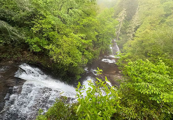 There are actually two waterfalls here, each on a separate creek. On the overlook, you stand at the top of Connestee Falls on Carson Creek. Across the gorge, Batson Creek Falls cascades down to meet Connestee. The now-joined creeks squeeze through a cleft known as Silver Slip, but you can’t see it from the upper overlook. You can see Batson Creek Falls pretty well from the overlook, but not Connestee. I’ve heard people say they thought the view from the deck was good because you can see Batson Creek Falls fairly well. That’s true, but my beauty rating is for Connestee Falls.