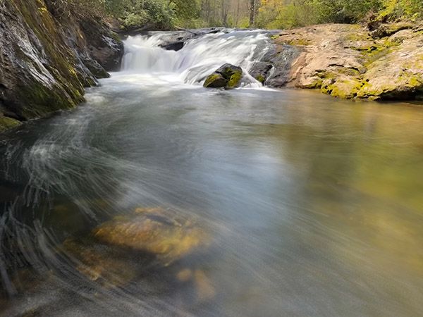 Most folks who drive along US 64 between Franklin and Highlands have no idea this waterfall exists. I’ve known about it for as long as I’ve been waterfalling, but gave it only a cursory mention in my waterfall book. But don’t get too excited about a grand new waterfall to visit. This one isn’t on par with Cullasaja River’s other waterfalls and reaching a view of it requires an insanely steep scramble down the bank.