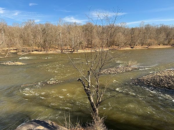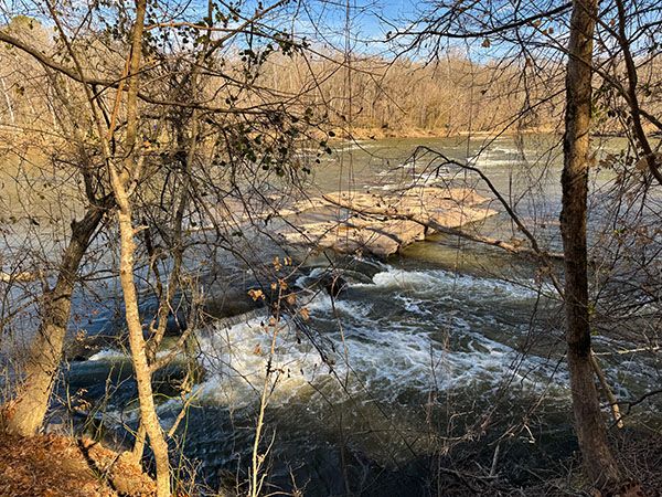 Fish Traps, a rapid on Cape Fear River, resembles a smaller Lanier Falls, which is upstream. Both are in Raven Rock State Park and accessible by hiking trails. As the name suggests, the waterfall is the site of historical fish-catching operations.