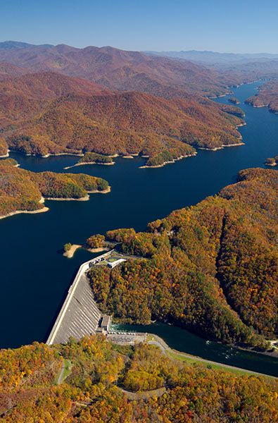 Fontana Dam is a product of the huge demand for electricity to manufacture aluminum to build airplanes during World War II. Crews worked around the clock, completing the dam in only three years. At 480 feet tall, it’s the highest dam in the eastern United States. It stretches 2,365 feet across the gorge.