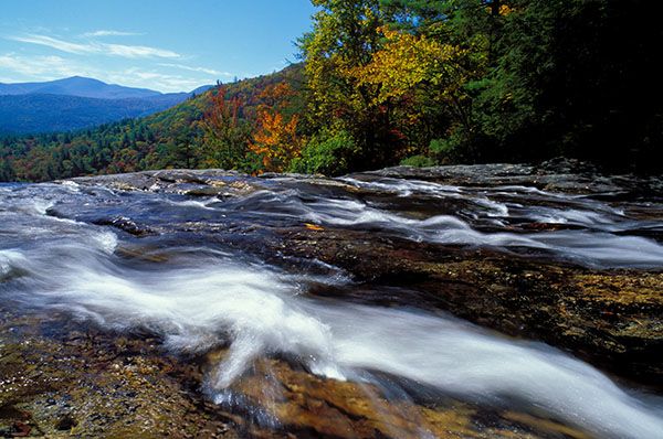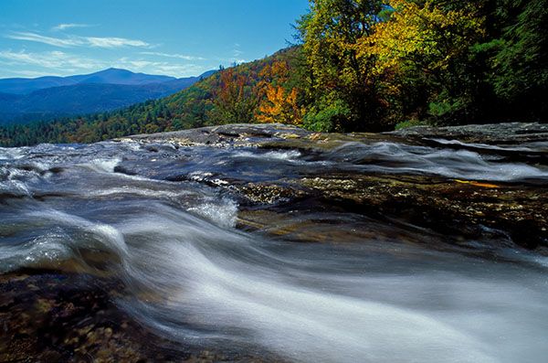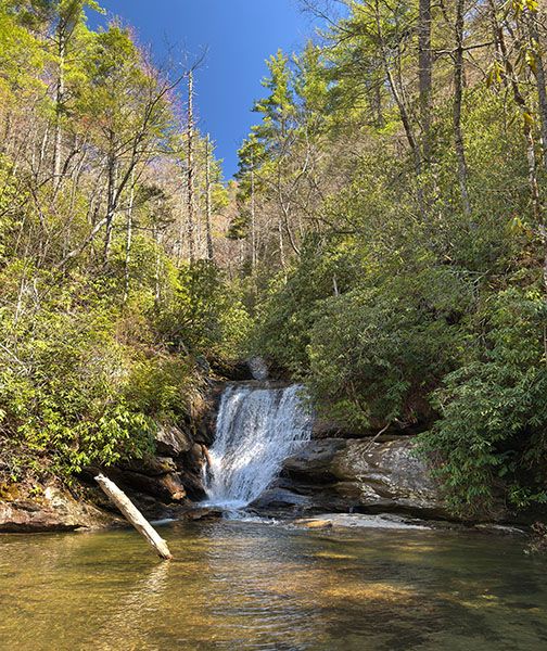 From the junction of US 64 and NC 106 in Highlands, drive 1.75 miles south on NC 106 and bear left at the sign for Glen Falls. Don’t take Holt Road, which turns perpendicular to NC 106. Take the unpaved Glen Falls Road (SR 1618), which bears right, immediately after the turn off NC 106. Drive to the end of the road at 1.05 miles and park at the turnaround.