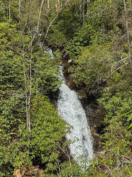 The view I found is high above the creek looking out over what I assume is the main upper section of the falls. I walked a few hundred feet down the trail and headed down the slope at this point: 35.027848, -83.239212. It’s not far down to the view at 35.027831, -83.239407. There is an opening through the trees here, but there is only a couple square feet for you to stand, precariously perched at the edge of a cliff. Suffice it to say that I don’t recommend it!