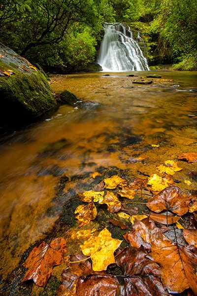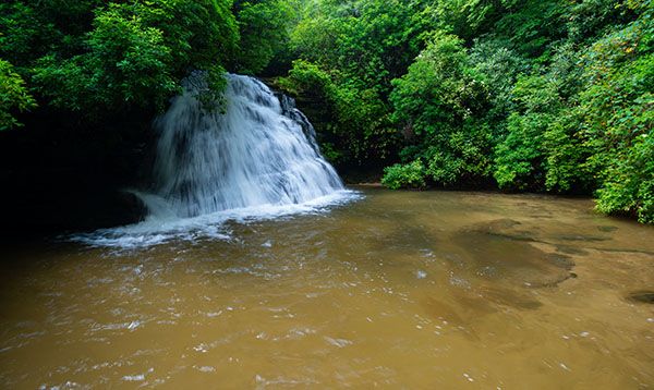 Cross the bridge, walk less than 0.1 miles, and turn right at the fork. Walk about 0.4 miles to the end of the road at the top of the falls. Follow the trail path down the river-left side to a steep path that leads down to the creek at the pool below the falls.