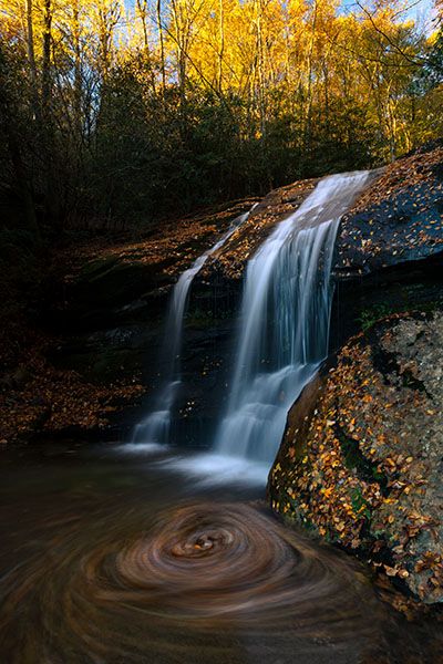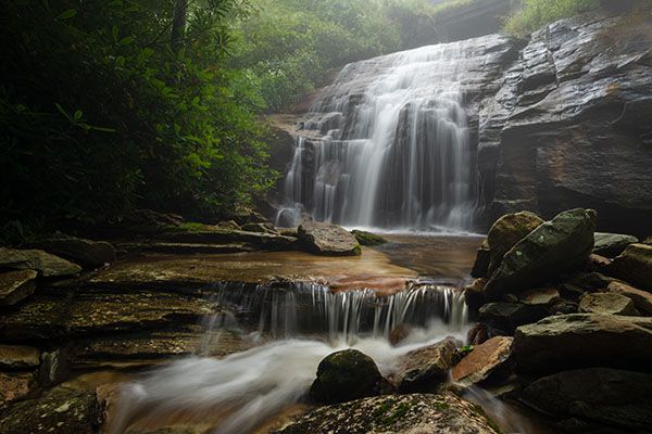 Among North Carolina’s most viewed waterfalls since 1892 when the precursor to US 221 was built—literally splitting it in half—Green Mountain Falls is nevertheless underappreciated, perhaps in part because of its roadside location. People tend to take for granted that which comes so easily and a waterfall you can see clearly while you drive by is a good example. But for those who take the take to pull over and explore it closely, Green Mountain Falls is a special treat. It won’t make anyone’s Top 10 list, but it’s worth more than a drive-by glance. You need to catch it with a good flow for it to look its best, though. Come here when it’s running low and you probably won’t be too impressed.
