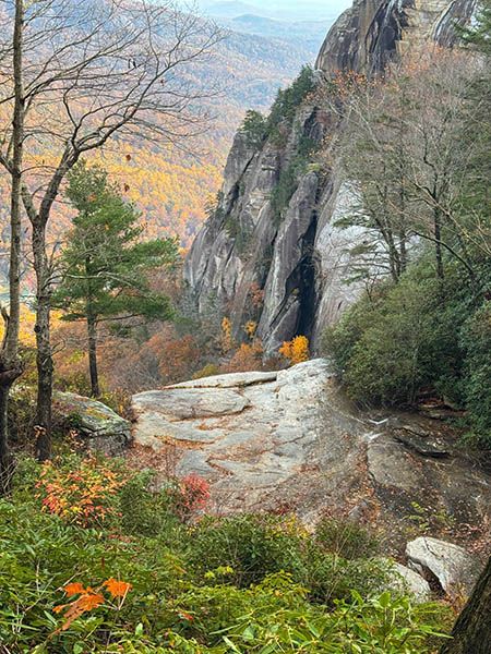The entrance to Chimney Rock State Park is off US 64/74A in the heart of Hickory Nut Gorge at Chimney Rock Village. You can’t miss it. Drive the entrance road to the top and park in the large gravel lot on the left just before the road ends. An admission fee is charged.