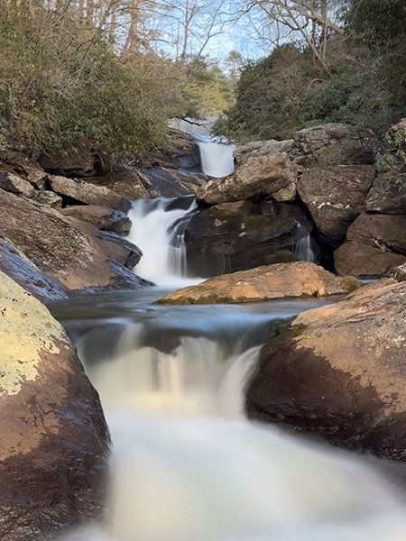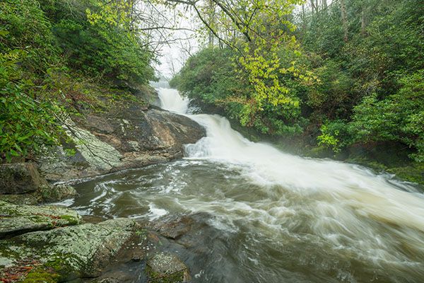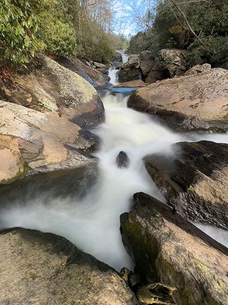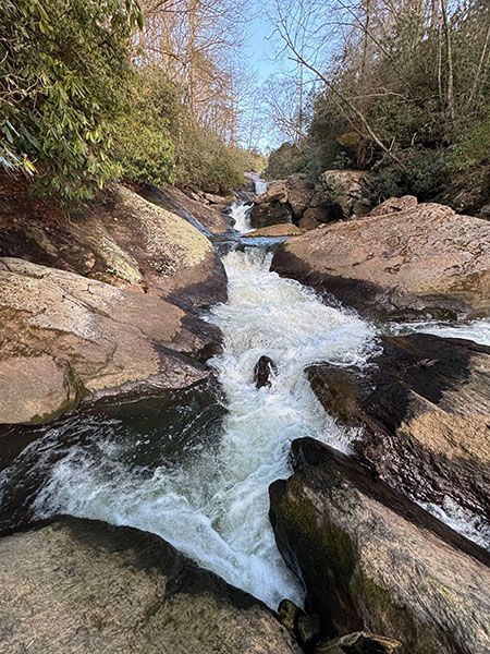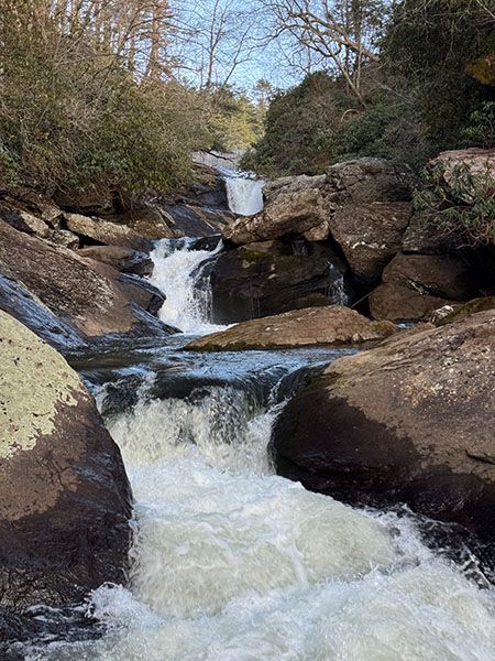 For experienced waterfallers, there is one reasonable vantage point located midway between the two main drops, but caution is advised. Reaching a view from below the falls requires a Class III bushwhack that is not recommended for anyone.