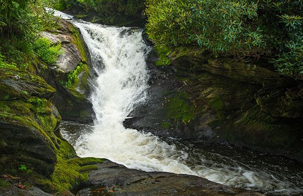 An obvious and short path descends to the bottom of the dam at the top of the falls. Reaching any other view requires scrambling through the rhododendron.