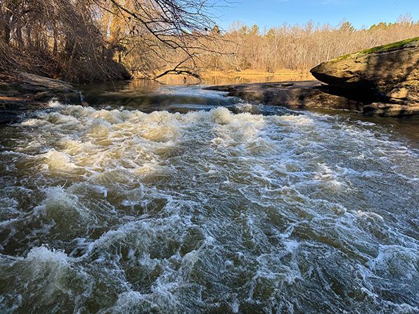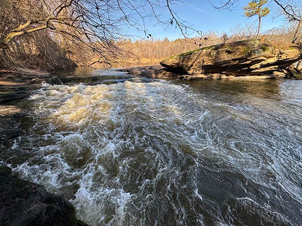 Lanier Falls is the most impressive waterfall on Cape Fear River. But remember, on Cape Fear, “waterfall” means rapid, in this case a Class II. Regardless of how you feel about a rapid having a waterfall name, Lanier Falls is a fine destination, and only one of several in Raven Rock State Park.