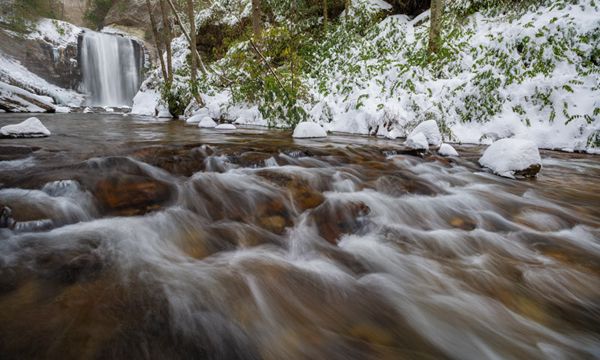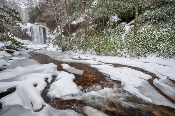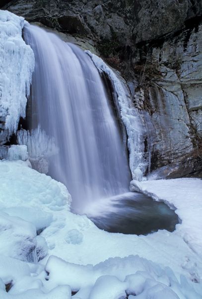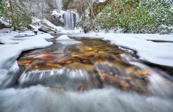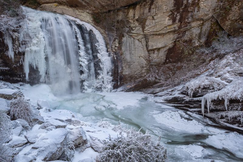 Easy access, size, and beauty combine to make Looking Glass Falls among the most popular waterfalls in North Carolina, no matter the season. I especially like to visit in winter, when icicles hang from the top and the plunge pool sometimes freezes over, leaving only a small area at the base unfrozen.