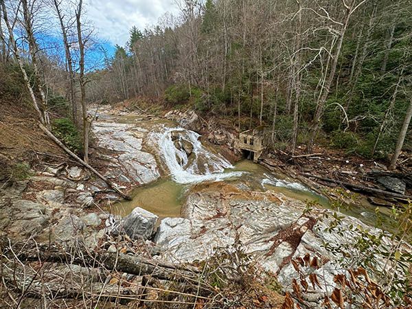 Hike description after Helene: You’ll have to navigate the landslides and fallen trees. The old road now comes to a viewpoint high above the falls. The best way to reach the base is to descend to the river along the landslide closest to the falls. From there, it’s a short easy walk along the riverbed up to the falls. falls.