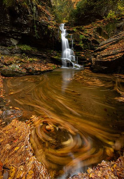 Follow dirt road 1 mile to fork and turn left. Ford creek at 0.3 miles and enter fields. Walk to far right end of fields (0.4 miles from the creek crossing) and enter woods on path. Walk 200 yards to point near creek, then follow winding, makeshift path upstream 0.45 miles to Milton Bradley Falls. Climb path on river-right side of falls to top, then creekwalk about 0.25 miles upstream to Bradley Cooper Falls. To reach Marilou Bradley, you can follow the tributary upstream that flows into Little Cove Creek below Bradley Cooper.