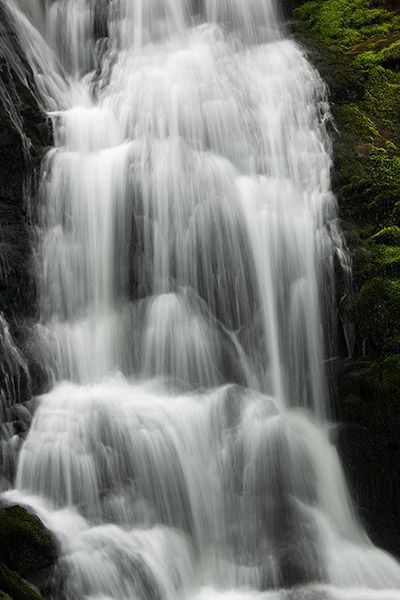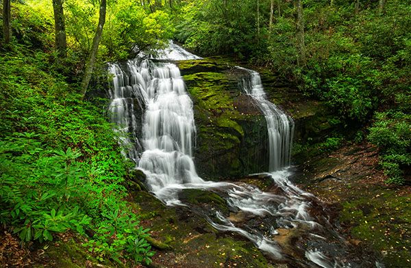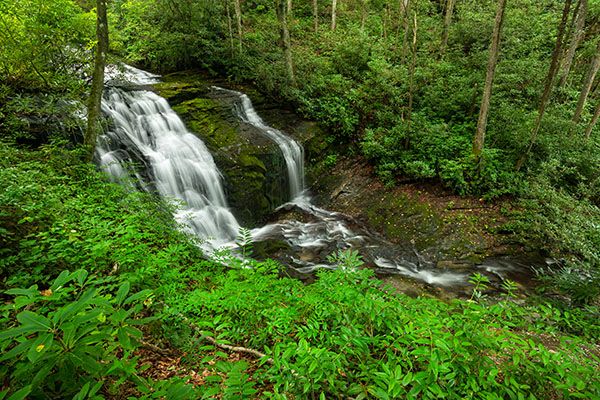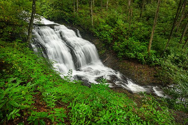 From Cedar Mountain on US 276, south of Brevard, turn on Cascade Lake Road at the sign for DuPont State Recreational Forest. Drive 2.5 miles to where Staton Road turns right. Don’t turn; continue straight on Cascade Lake Road, which soon becomes unpaved, 1.8 miles to the falls, on the left. There is barely enough room to pull over on the right side of the road, opposite the falls.
