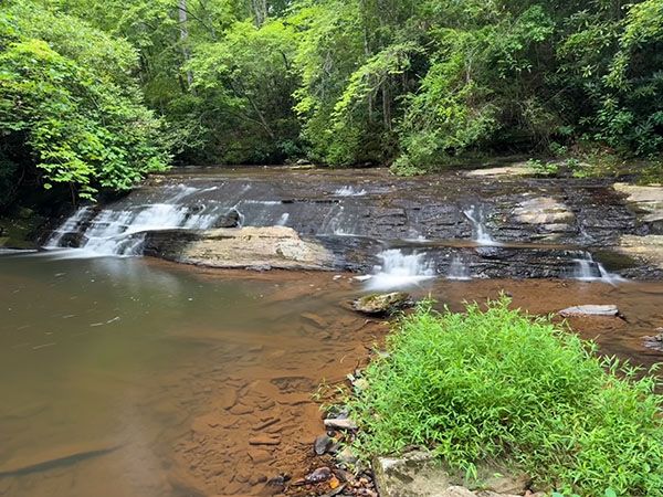 Hike Grassy Creek Vineyard Trail/Forest Bathing Trail to a fork. Turn left, walk a short distance, and turn right on Cascade Loop Trail. The upper waterfall is a short distance farther. The middle waterfall is 100 yards downstream from the upper falls.