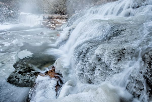 A house lies on the river-right bank, spoiling the view in my mind. The red house that sits above the mill on river left has never been a big distraction to me, as it’s old and fits with the overall historical aspect of the waterfall and mill. In fact, it makes an interesting enhancement to photo compositions, especially after it has received a new coat of paint. Fortunately for photographers, it’s easy to compose shots that exclude both houses, although you may still wish to shoot some compositions that include the red house.