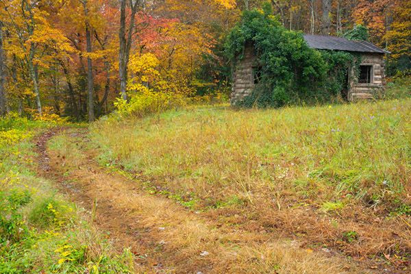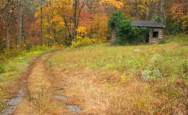 Follow the dirt road 1 mile to a fork. An old barn once stood in the corner, but it is now gone. Off the road to the right is an old cabin. Turn left at the fork and hike the sandy road 0.3 mile to the Cove Creek crossing. Expect to wade. After crossing, the old road follows the creek upstream a short distance before turning sharply left and ascending to fields.