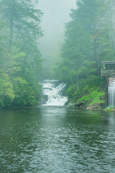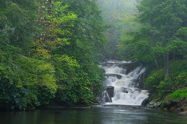 Only a few hundred feet from US 64, near Highlands, is the scenic and whimsically named Naiad Falls, dropping directly into Lake Sequoyah. Few travelers on the highway know it’s there, and even fewer have seen it as the only public access is by boat. A visit to the falls by canoe or kayak is a rewarding experience.