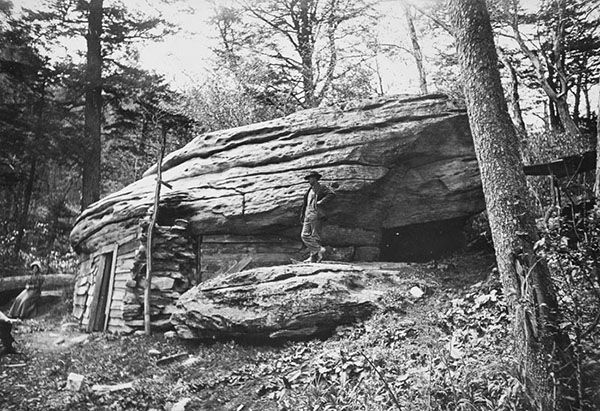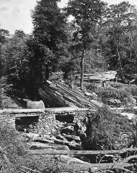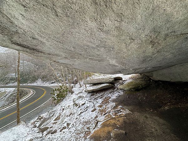The more interesting sight here is the huge rock that overhangs the stream and the rock shelter that’s up the hill behind it. The shelter has been known to harbor humans since at least the time of the old Yonahlossee Road. See History below.