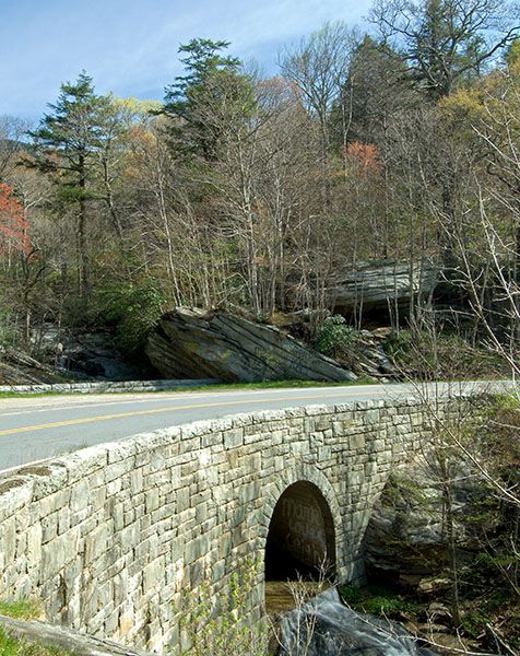 From the junction of US 221 and Blue Ridge Parkway, near the entrance to Grandfather Mountain, drive north on US 221 for 2.6 miles to the wide paved pullout on the left (uphill) side of the road. The pullout is 6.5 miles south of Holloway Mountain Road.
