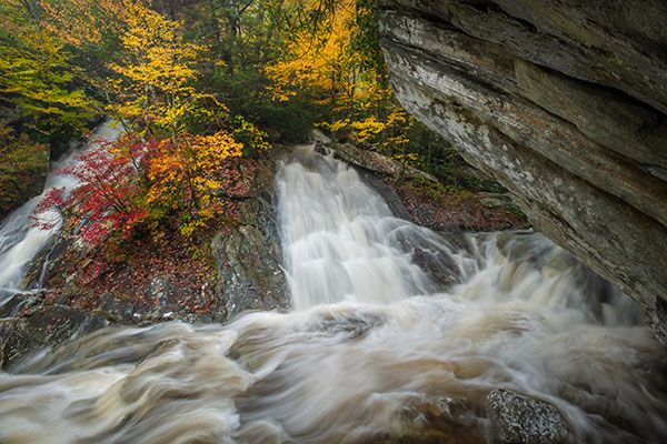 This is not a destination waterfall, but rather a pleasant stop on a drive along the scenic US 221 between Blowing Rock and Blue Ridge Parkway. If the creek is flowing well above normal, the waterfall is rather nice but at other times it won’t be the star of the show. Actually, there are two waterfalls here, one on Wilson Creek, the other on a side stream that flows into Wilson right at the pullout.