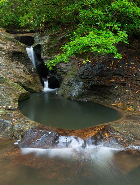You’ll follow an old road on an easy grade for 0.2 miles to a small creek crossing. Beyond the crossing, don’t take anything to the left. After a little over 0.1 miles, turn right on the obvious path and cross a small branch. After another 0.1 miles, you’ll cross Pot Branch, which should be easy except in high water. You’ll arrive at the top of the waterfall, 100 yards from the crossing. To reach the base, you’ll have to scramble down the bank.