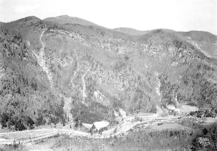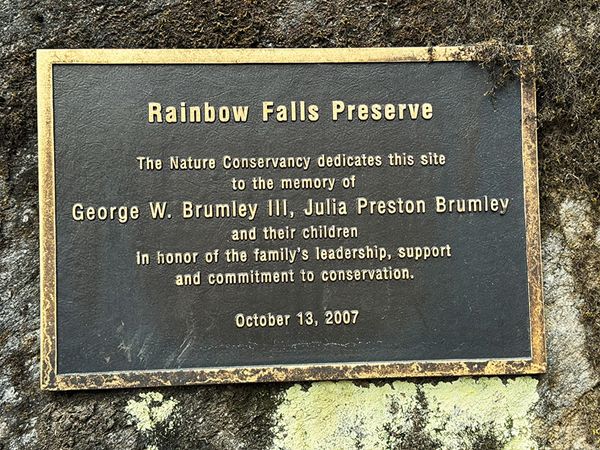 A small stream flows over the gorge walls between Bald Mountain and Round Top Mountain forming Rainbow Falls, a high waterfall located on the opposite side of Hickory Nut Gorge from Chimney Rock. The Nature Conservancy acquired the property in 2003 and later transferred it to the state park.