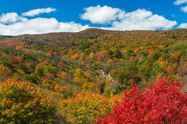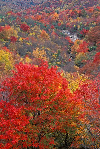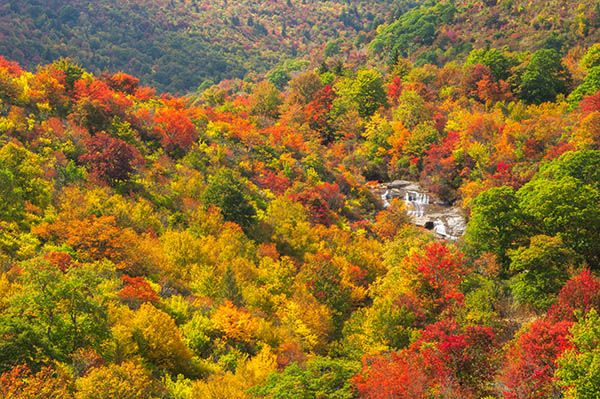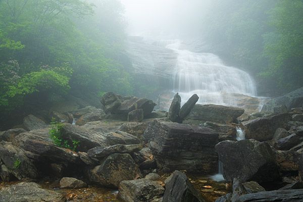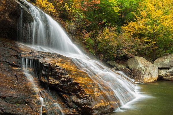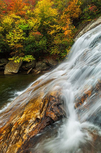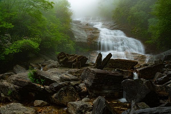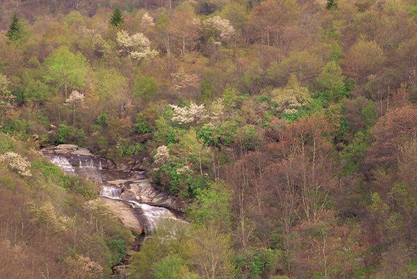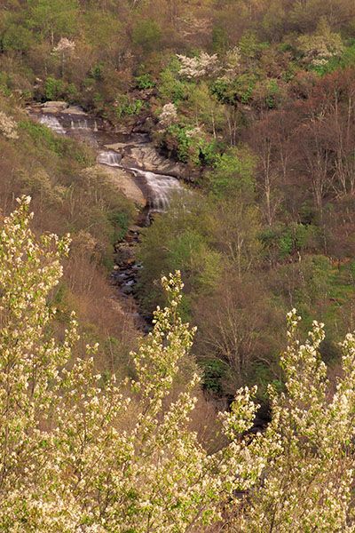 Catawba rhododendron grows on the banks of the falls, putting on a beautiful magenta show in June. In May, painted trillium blooms along the trail between the parking area and the creek.