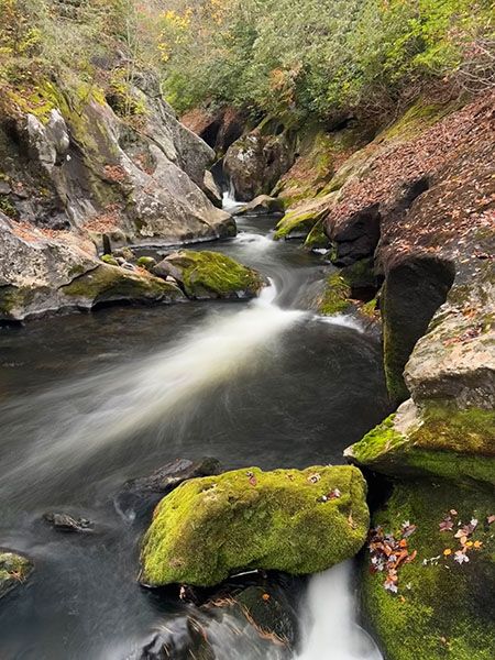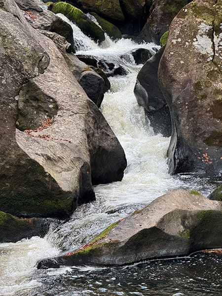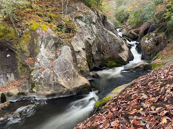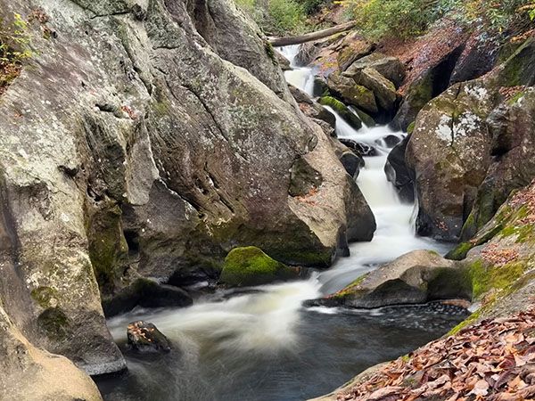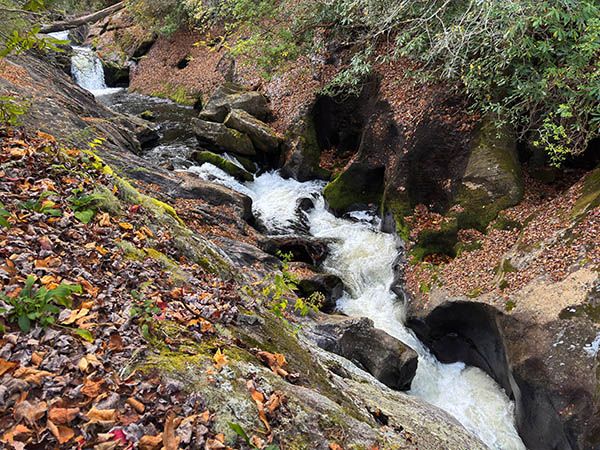 Hundreds of significant waterfalls remain unknown to most waterfallers in North Carolina, but it isn’t very likely for one to be discovered beside a heavily traveled national highway. Yet mere feet from US 64, on a stretch of road well known for waterfalls, lies a notable fall that few people have any clue of. It’s not a high falls, but it’s an exciting one, the full force of Cullasaja River squeezed into a rock-sculpted mini slot canyon less than six feet wide.