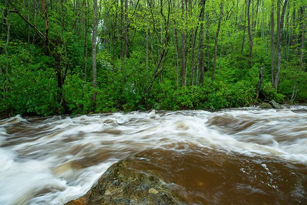 If the conditions are perfect—high water, no leaves on the trees—you might wish to scramble down the bank to the edge of North Fork French Broad River for a more open, though still restricted, view.