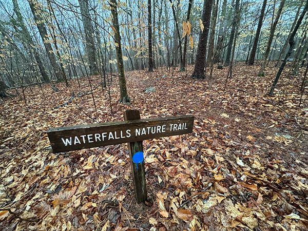 Waterfalls Nature Trail, a loop trail, begins at the upper end of the parking lot, to the left of the picnic shelter. Follow it to the falls, which is about halfway along the loop. The loop comes out at the lower end of the parking area.